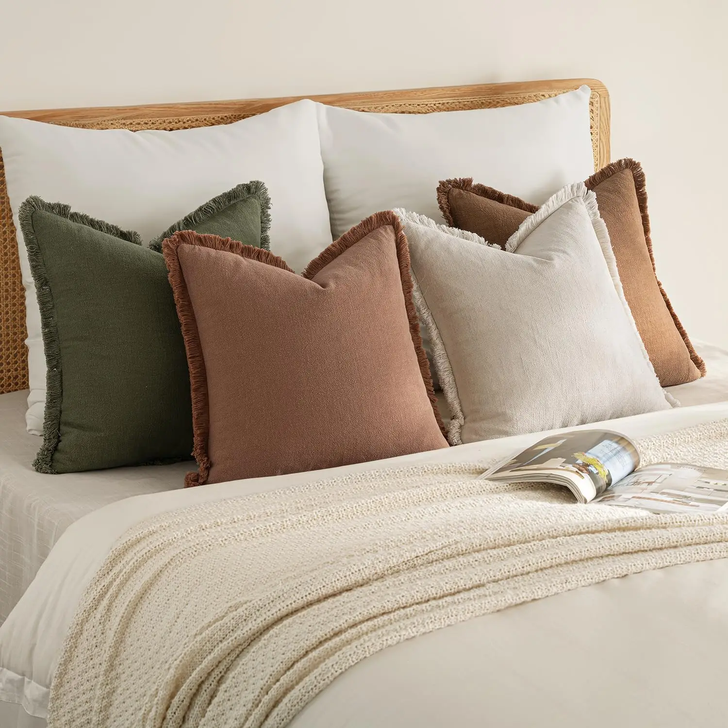 Set of 4 Neutral Linen Fringe Throw Pillows, Soft Rustic Cushions for Sofa Living Room Decor, Beige/Brown/Green